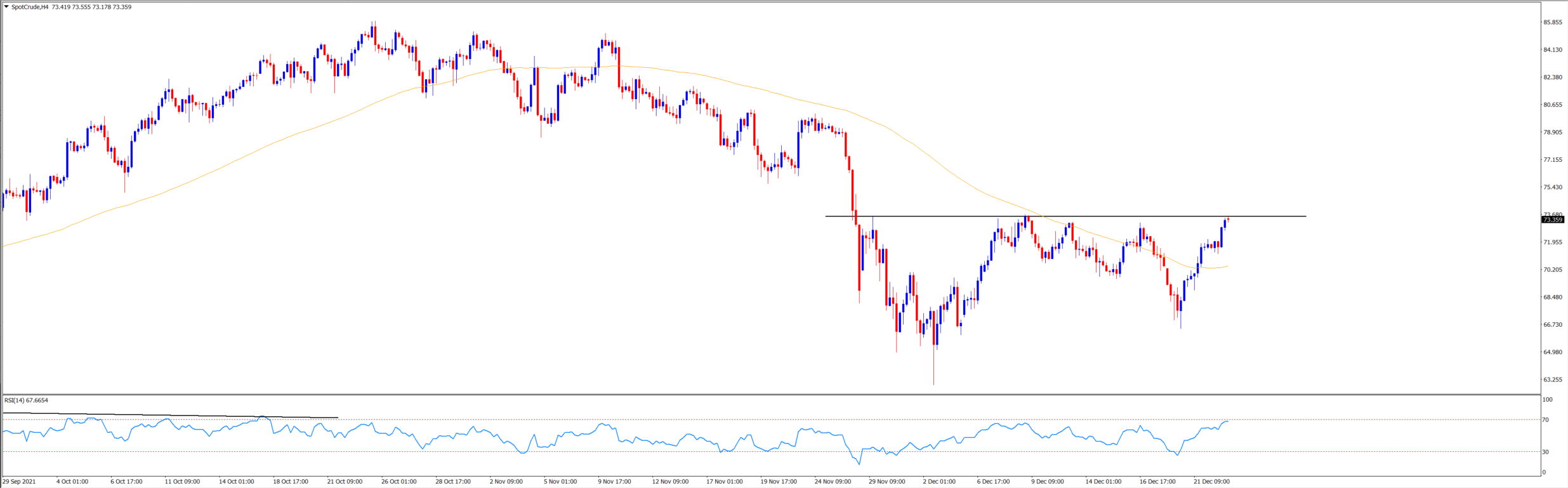 欧洲的天然气价格飙升是对经济和汇价的另一大考验。若隐若现的欧洲能源危机以及美国原油库存的大幅降低,帮助WTI油价回升至73.31。在即将挑战100天均线的时候,RSI在小级别周期上出现了超买的迹象。