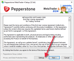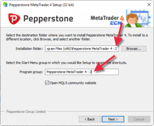 2. 如需选择第二个MT4程序的安装位置,请单击“设置”以显示安装目录的设定。 在默认情况下,它将安装到’C:\ Program Files(x86)\ Pepperstone Metatrader 4’,但是您需要将第二个软件安装到具有不同名称的文件夹中,例如’C:\ Program Files(x86)\ Pepperstone Metatrader 4-2’如下图所示: