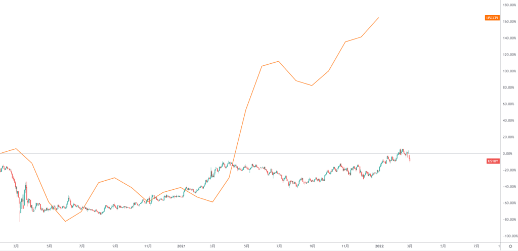 在指数或者外汇采用的经济分析中,诸如非农数据、物价数据、基准利率、PMI指数等基本面指标,同样可以以指标走势图的形式直接添加进图表当中,变与直接观察指标汇价的内在联系。例如下图中的橙色线段是美国核心CPI同比变动,蜡烛图为美国十年期国债收益率可以发现通胀对于美债收益率的拉动因素。