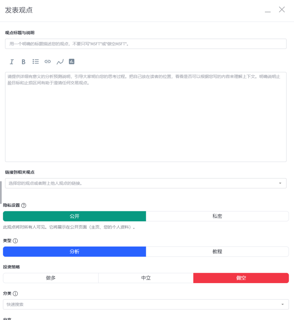 以往形形色色真假难辨的晒单截图,让人真假难辨,究其原因在于这些订单很容易被人事后根据看得到的行情篡改。另一方面,许多分析人士在落子之前并没有认真的分析市场,记录自己的想法,从而凭感觉分析,难以获得提升。TradingView的另一大特色就是“想法/观点”功能。在绘图界面中,添加好指标或者绘图之后,可以点击右上角的“发表”按钮。此时将会进入到编辑页面,在这里输入你观点的标题,标题清晰明了的阐述你的观点;在主体部分输入文字表示你分析的理由和思路。最右侧可以用标签进行归类,便于后期查找;选择你分析判断的行情方向,勾选使用的分析方法。点击发布,一个“观点”就编辑完成了。