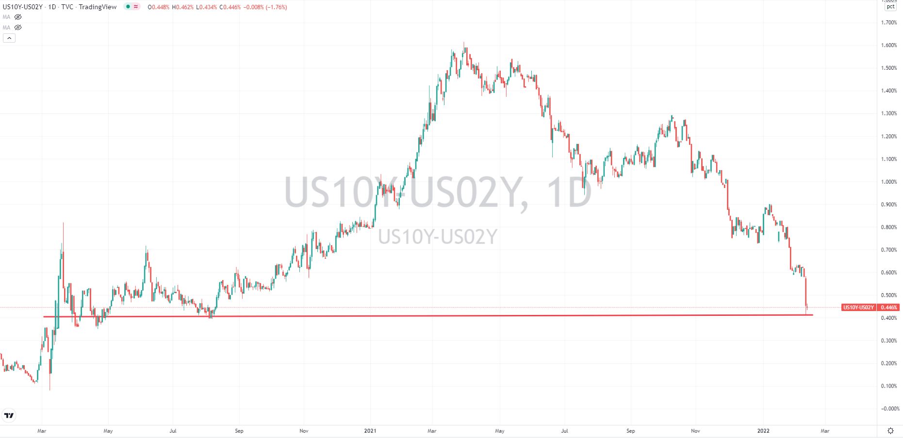 利率市场显示,3月加息50bp的概率高达80%,2022年预计加息6.5次,而这个数字昨天才是5.4,去年年底时还不到4次。与快速飙升的加息预期相呼应的是美债收益率,10年期已经突破了2%,站上了两年多来的最高水平,收益率曲线的平坦(利差收窄)暗示投资者担心过快的加息幅度可能损害经济复苏,甚至引发经济衰退。