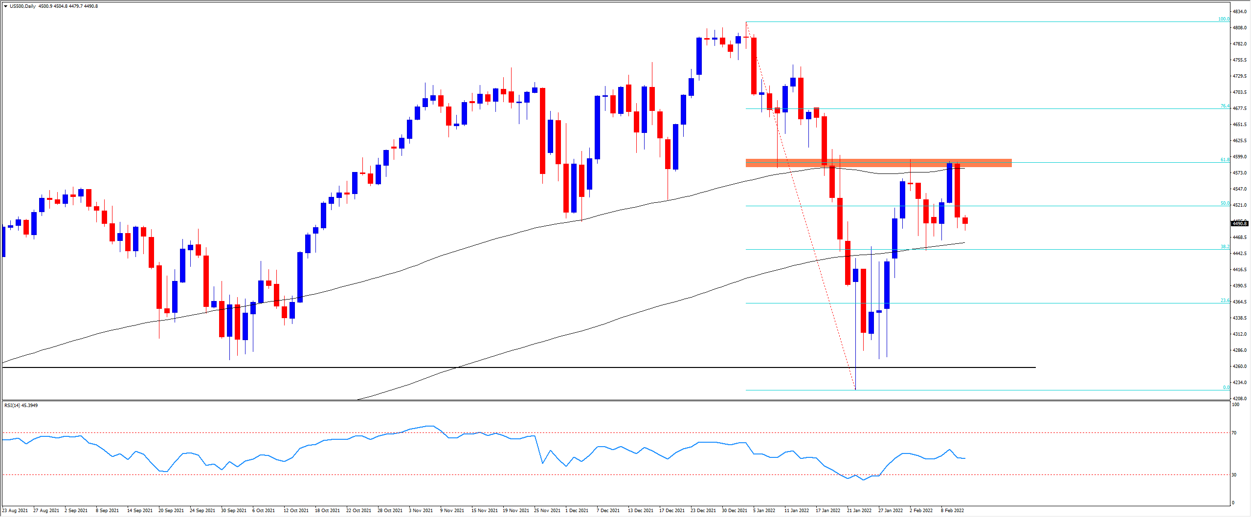 火爆的数据和激进的预期吓坏了股市投资者。恐慌指数VIX跳升近20%,美国三大股指全线回落,刚刚出现反弹迹象的股指再度转跌。下图显示的是标普500在4600点和100天均线附近的阻力区域承压回落。科技股为主的纳斯达克对利率更为敏感,跌的也更惨一些。
