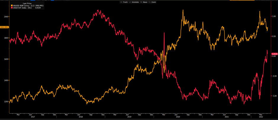 对黄金来说,昨天在1909附近折戟,没能进一步上探1920一线。较长的上影线和连续下移的高点突显出金价近来的弱势行情。更重要的是,利率的上升让多头暂时缺乏信心。下图显示美国的实际利率(红线)经过连续的拉升之后已经回到正值区域,而同期黄金(黄线)的跌幅却相对有限。这有没有可能拖累金价进一步震荡下行?