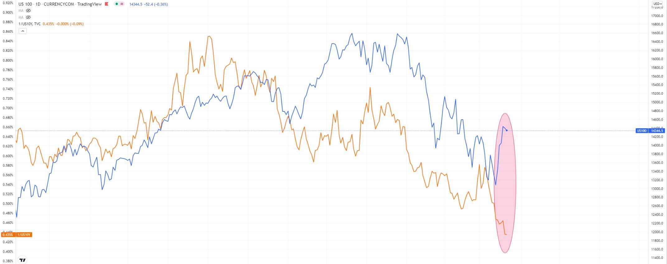纳斯达克100指数(蓝) vs 10年期美债收益率的倒数(黄)